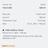 There is no one to call if you have a problem! Not being able to contact the driver is also really annoying. Once a skip driver drove right past our house and didn't stop, said it was "delivered" and kept driving. Out 70$ and no food! Seems like it should be easier to fix a problem than it is, time to step up skip. I like door dash for that reason