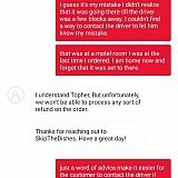 I will never be ordering from skip the dishes ever again! I had ordered a few days ago and put my address as the right address. So usually when i do that i don't need to worry about the address being one of the other addresses. Well! For some reason the address was not mine and was not far from me either. The Driver I guess had a hissy fit by himself and decided to not drop off the order to me after he phoned me and i was explaining myself and giving him the right address, while he hung up. I sent feedback to let the skip team know of the situation. Well guess what they wouldn't even ask the driver to drop off my food and said they are not reimbursing me... $61.00 down the drain. Now me and my kids don't get that KFC but guess who does?, the driver and I was only a few blocks away from where the driver was gggrrrrr. They have just lost a really good costumer. No consideration for the customer only for feeding their drivers. So sickening.