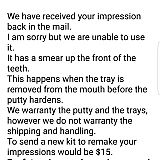 I sent a picture 4 my impressions and they said it was good. And then they emailed me saying the impression isn't good and they need a $15 to send me another kit. They did this to me twice. I took Impressions like seven times. I left the impressions in my mouth for about 7 minutes and they still said that some smear appeared like 5 times. I asked for a refund and they took $15 out of my refund and they said it was for shipping the product. It's a whole scam.