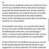 First of all, the dress i received was a different colour to what I ordered and also didn't meet the quality of how looked on the website. This is disappointing enough. However, when I attempted to return it I got endless replies trying to put me off returning it. I paid £108 for the dress (definitely not worth the cost). I continued to insist I wanted to return it. However they then began to say if I shipped it back "it might get lost". Clearly teeing up to say it was lost and not give me a refund. They ended up refunding me £40 after negotiations and I am left with an ugly dress which is not worth £70 to try and coup back the money I've lost.