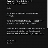 I've had my account at Branded Surveys for about 3 months and would periodically go on and do surveys, and had amassed around 1,500 points or so. I tried to go onto my account to do surveys today, only to find a page telling me "oops! Looks like you are unable to participate in our surveys." Come to find many people are experiencing random account termination. I looked into the issue further, and come to find out within it's policy, it has written that it "does not have any commitment towards any Users, past or present. Branded may at any time, for any reason, with or without notice, discontinue the Branded Surveys Program, the Site, and all Services, for one or all of its Users." What an awful business policy. I have yet to hear back in an email from them, but I know it will most likely be something along the lines of "We are sorry, we care very much about the validity of our community, and find your account to violate our terms of service." I bet I will see that on a response from the company to this review as well, because it is very clear they are using automated responses to reviews most likely based on key words. I am a US resident, have not lied on my surveys, and am not using any sort of proxy or autofill bot. Obviously I lost around $15, which I most likely will never see, but I am encouraging everyone to stay away from Branded Surveys, because they are solicit free labor from people.