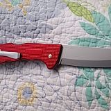 A big knife but trim and scary sharp. Solid lockup and very well balanced.
