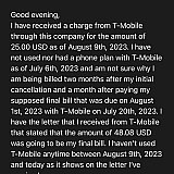 So I made the dumb decision as an 18 year old to switch to T-Mobile as an act to rebel against my mother and find independence. When that didn't work out, I decided to switch carriers and notify T-Mobile of my departure with their phone service. The reason for my departure was because they suddenly raised the price from 125 (what I originally paid) to 148 for a reason I don't know. When cancelling, they took 148 out of my account the next day and I disputed that charge with my bank for the charge being taken out unauthorized even when I turned off auto pay. They've had an incident like this before when I manually paid T-Mobile for the month and them taking out more money along with that. Anyways, T-Mobile sent me a letter stating that my final bill was due on August 1,2023 for the amount of 48.08, I paid that bill thinking that would be the last of it, I was wrong.