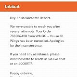 My delivery was not done due to delay from Talabat and i requested to cancel the order. I got an email from Talabat mentioning that they couldn't reach to me after several attempts. Seriously?