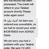 It was difficult to trace the order or get a refund. Very dissapointed with the service. I received a message at 10:05 offering a 6.0 AED voucher as compensation. Too little too late.