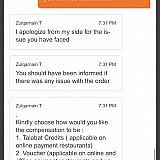 Online staff is very incompetent. They don't have willingness to retain customer at all. NAWAZ T did not put any efforts to talk to customer and resolve issue. Very disappointed services, for a order need to wait more than an hour there's no response from the customer service. Wasting of our time and food will get cold So please don't cheat the people if u can't keep the promises before you giving. I will never choose through talabat next time.