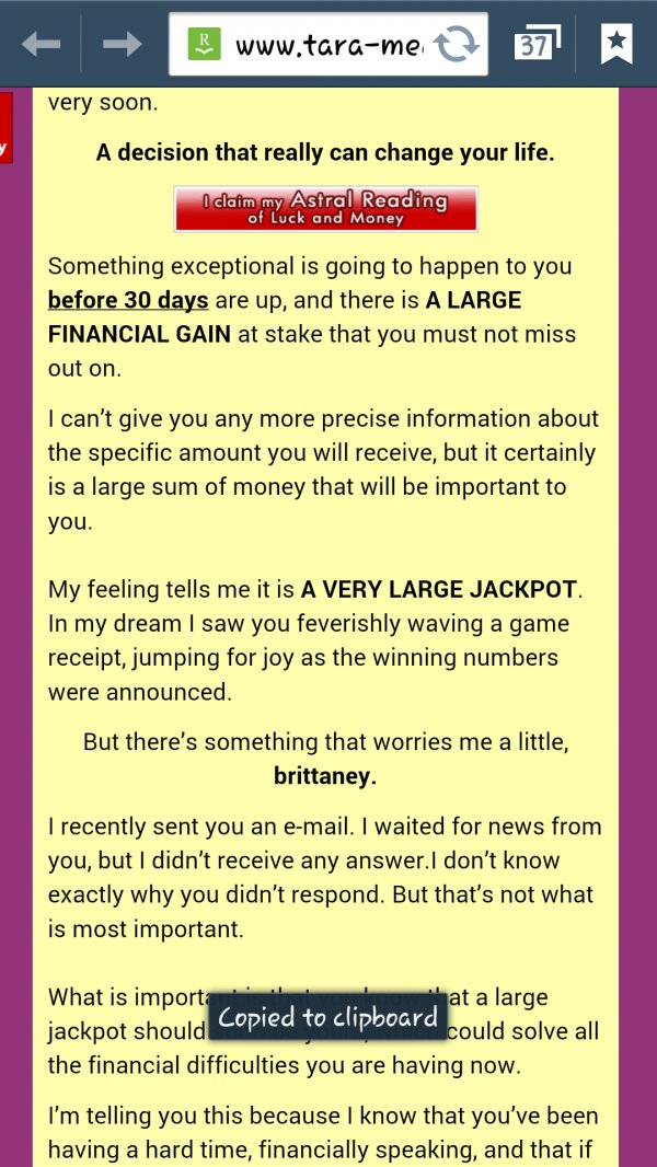 She then sent response email telling me to large sums of money and lucky numbers i paid her site was down for three days before i could get anything and when it finaly back up no luck numbers no large sums of money but emails about needing more work that she says she going to do for free and then click on it and she wants to charge you again.