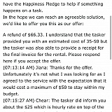 I contacted TaskRabbit. They fought with me a little bit before getting to the point of offering me a reimbursement of $80, expiring on March 17th. I had budgeted and prepared for a cost of $50 so I was still unsatisfied, as I felt I had been tricked into using this service. I then had some personal matters to address, so I was unable to get back to them in time. When I reached out a second time, asking for understanding for my personal matters in the process, they simply said we cannot offer this anymore. Both conversations are attached. No resolution whatsoever.