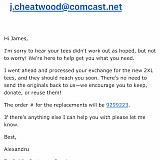 When I originally tried to order a shirt using my daughters address to ship to, my credit card rejected it. When I put my home address in it, it went through with no problem. However, I forgot to change the color and received the t-shirt in another color then what I wanted. After contacting them how to exchange the t-shirt they told me they would correct my error and send me the corrected color t-shirt. Then to my surprise, they told me to keep the original shirt. Even though the error was mine and not theirs, I was surprised at this. This is a most friendly customer service company. Best customer service ever.