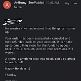 I ordered a hoodie for my cousin and I needed it by the 20th. However I forgot to read the fact that it was shipping in business days and that it would not be here by the 20th. I needed the gift urgently so I contacted them to see if I could do anything about it. They communicated with me and at the end helped me cancel my order and refund my money. They were extremely nice and understanding. They also replied surprisingly fast. Faster than many other companies. Overall I had a great experience!