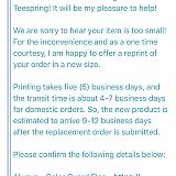 Answer: AWe are always happy to offer a resolution for any item that is not printed or received as originally shown in the order confirmation. Buyers in need of assistance can visit our Help Page at any time, choose the "Contact Us" option, and receive a response within 24-48 hours. Thank you.