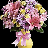 I ordered a pretty pale yellow vase with a big pink ribbon, filled with cheerful flowers, and lots of them. It came in a clear vase with more greenery than colorful flowers. Totally disappointed.