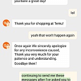 TEMU contacted me after the initial incident resolving the matter by giving me $5 off and a credit in the amount of my original order then literally sending an order again without any problems in delivery. I recently placed two orders and waiting to see if it will be delivered as promised. I noticed in the advertisements they use boxes to show orders being delivered. The packaging was a bag and I order shoes packed in a bag left bunched marks that I had to put paper to bring them back to form but the other products, I was pleased with but the quality is what you pay for so do not think you will get the level of quality if it were a name brand product. However, the prices are phenomenal and there are a wide variety of products to choose from and since I am on a fixed income, I didn't expect much but was quite satisfied with everything I ordered. Now the numerous updates or ads to encourage more spending becomes aggravating as the notification sounds gets monotonous.
