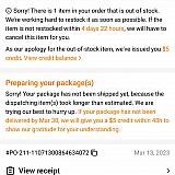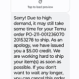 When I placed my first Temu order that order came so fast it was unbelievable even quicker than things on Amazon.So then I placed more orders this was about 2 1/2 weeks ago now all I get is a lot of notification spam them apologizing of their delay and things that should be on stock out of stock because they have waited to long to send my order that the product run out of stock.Who in their sanity wants to have this kind of shopping experience is super frustrating.I don't want to pay to be annoyed and frustrated.Yet I see all the free loading YouTubers being served so kindly yet they are getting free things while I am paying for my orders I have to wait while others (free loaders) get their order first.I don't think I will be ordering from them anymore and that's how you loose customers.