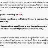 Addressing your case with our manager, we came up with a compromise: a partial refund up to 10% could be processed, and cancellation for the automatic renewal to spare you from rebilling. If this is agreeable, I can proceed immediately. And you still have the option of picking a new program on our website www.tenorshare.com as a replacement for free.
