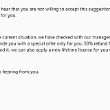 - They wrote back and offered a lifetime license to one of their other products (which I have no interest in, and couldn't trust would work anyway). I declined, and asked for a refund again (fourth time).