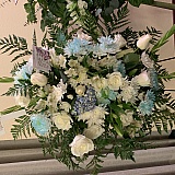 The other picture is entitled "Crap they delivered". It is NOT even close to the same spray. It is much smaller and smooshed up. This had poorly died blue mums, then some white ones, no pretty lilies, NO CRYSTAL cross, just a wooden dollar store cross pick that said sympathy, one dying hydrangea, and drooping roses. It was DISGUSTING. I was MORTIFIED!