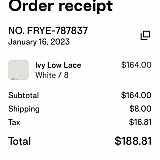 Images: Order, shoes I received and the pair they match to on the Frye website, and a picture of the shoes I ordered for comparison.