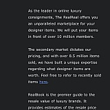 Answer: I do NOT recommend selling through TRR. Read all seller reviews. This a speed selling co trying to cash in on a quick commission. The prices they assign are RIDICULOULOUS at best. They are not there to get you a good price but a fast buck for themselves. They priced a brand new prada bag with a label on at $625. Minus 20% permanent discount, 60% of that, I receive a whopping $312. After 10 days wait of processing and seeing the prices assigned I pulled my items. I was shocked and even more upset. I rather give the cloths to charity or sell them myself. I think it is insiders who buy the best items at dirt cheap prices they assign themselves. As a buyer just today I receive a wrong item. They were going to research the problem and find the item I purchased, a coat. They sent me a dirty silk top... This is after waiting for 10 days to get the wrong item. This co is just very bad. Customer service is spotty. Some reps are just dreadful. They sound like this is a summer gig and they got no training, you can never speak to a supervisor, none is ever available, Read the reviews and decide if you still want to use this co. If you do, you will be disappointed,