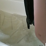 I tried on jeans. I could not see or smell a problem. I put in WHITE tub in warm water to see if blue would bleed before washing. See pics. Disgusting brown gray filth coming off jeans.