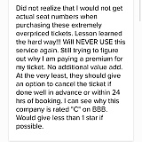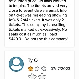 For some reason this company comes up at the top of the Google search when I entered California State Fair concert tickets. So I thought I was buying tickets from there. Turns out, the Fair uses a different ticket outlet and the tickets I paid $59 each for are supposed to be $25 each. I thought I was getting letter section seats, instead the email I got says general admission. Of course there is no way to cancel or get a refund. I was just trying to do something nice for my dad, taking him to see Kool and the Gang for his birthday. Now I can't even feel good about it because this company played me.