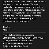 Answer: They will not refund your money. They are scam artists who mimic real ticket sites and venue box offices and take advantage of consumers. They are dishonest and horrible and should not be operating.