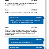 I was concerned about the tickets that i purchased and just wanted more information about how to acquire the tickets. After calling and only getting responses from machines we got re arraigned to an online chat where the customer service representative would not help me with any information concerning the authenticity of my ticket or allowing me to contact the seller for confirmation. I will absolutely never use this site again.