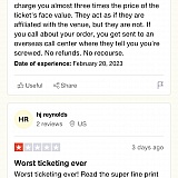 CRAFTY DECEITFUL TACTICS. If your like me you are unfortunately reading these reviews too late. Sorry this happened to you as well. This is more of an outlet to let you know you are not alone. Hopefully one day someone takes companies like this down. I have done all that I can to report to every bureau and review portal - if we can prevent one person from giving this company their money than its worth it. They know the game and have it down to a science. Searched venue specifically - their website came up with the venue name in all caps at beginning - honestly thought I was purchasing directly from venue so I was trusting the prices and the amount of tickets they were showing were left. I was burned big time, paid double for tickets, charged a $200 fee on top of it. Their website and policies are crafted so well, you think you're going to a page to review before you confirm your purchase - then next thing you know all sales are final and you're an idiot. They sell tickets they do not even have, and they protect their shady sellers - who are likely still the same business they just found a loophole to operate this way. As soon as I realized the true cost I called to cancel and all they did was tell me how they have to honor the contract with the seller. Well, I haven't received the item yet - cancel it - NOPE. Called credit card to cancel purchase - they said nothing they could do even though purchase was pending, and I did not authorize additional excessive charges. Absolutely disgusted with people who are this low and deceitful makes me sick.