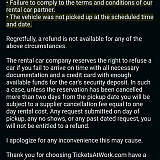 I contacted T@W on advise of rental company, to request they take my husbands name off, and switch it to my name. They would not change the reservation because our flight was delayed and we were passed the point of changing reservation without 95.00 penalty to make a simple change into my name. After 3 day email correspondence tickets at work has been decided now, NO refund is due because they talked with rental company and was told I was a no show, and a few other BS reasons there are untrue. Tickets at work will find any way to make any issue your fault and keep your money without any consideration to things that are beyond your control. Going to beg our HR department to discontinue use of this fake employee perk.