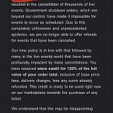 I purchased tickets for two separate artists last year. They were both set to reschedule because of the pandemic and only recently they were finally cancelled. I received a refund two weeks ago for artist #1, and received an email today for artist #2 saying that they are ONLY giving store credit.
