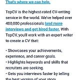 topcv.co.uk really helped me well on my CV with their honest, straightforward assessment. I was really surprised to see their quick responses. I couldn't thought of so many mistakes in my CV with its presentation and language. The review was well constructed on various aspects of the CV. Thank you Katie Warren.