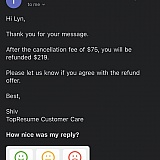 Worst company I have ever done business with. Do not hire them. You will absolutely 100% regret it. I purchased their top resume review service and paid 244.00 plus a 50.00 for a phone call. Immediately after my purchase, I tried to cancel the service because of the bad reviews I read online, and they did not respond to my email. They continued to ignore my emails asking to please cancel my request. They assigned a writer to my resume a week later. I asked, again and again, to please cancel, and they continued. My worst fear came true. They delivered a resume that was much worse than the one I submitted. I tried to dispute the charge. They finally agreed in writing to give me a refund minus a 75-dollar processing fee! However, the refund never came through. I filed a complaint with my credit card company. This company is a fraud.