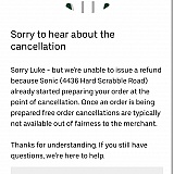 My son ordered food from Sonic, and one of the meals was wrong. So he canceled the order, and they allowed the cancelation to go through, but they won't refund his money. The order was canceled immediately there is no way they started preparing the food that fast. After contacting them, they refunded $25 of a $65 order. This is absolutely ridiculous. If a refund can't be given there shouldn't be an option to cancel the order.