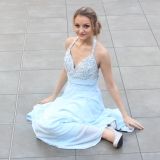 As soon as I saw this dress I just knew that I had found the perfect gown to wear to my 18th birthday party. The dress arrived today and once I had unpacked it from the box I knew that I had made the right decision, this was confirmed when I put the dress on, I was instantly transformed from a prince into a beautiful princess! If anybody out there wants to feel just like Grace Kelly in one of those old movies then I would definitely recommend this gown to them. I ordered the dress in a standard size but it fits beautifully and could have been custom fit for me, I recommend going off the sizing given rather than your regular high street size. The material is of a very high quality with a lovely weight of satin used, the embroidery is particularly pretty with just the right amount of sparkle without being too over the top. The illusion neck is super cute with a very nice shape to the lace edging and the bodice is nicely cut and padded to give curves in all the right places, I'm not wearing any padding in the photos I have attached yet as you can see it still looks like I have boobs! The buttons up the back covering the zip is a nice touch and adds a little touch of class. I ordered the dress in blushing pink as I am wearing it to a party and not as a bride and the shade is delightful, not too pale but a lovely baby pink. The craftsmanship is second to none with no problems to report and the length is a perfect ankle length on me, I'm 5'8", just right for dancing and swishing across the dancefloor. I really don't want to take the dress off and I can hardly wait for my birthday party to see the results of this dress combined with a full makeover, I've got a beautiful pair of satin heels that I'm going to get dyed to match the exact shade of pink of my dress. Now that my gown has arrived it just makes me even more excited for my party and I know that I will definitely be shopping at Millybridal many more times in the future.