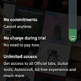 AVOID, AVOID, AVOID! I was charged £69.99 for a "7 day free trail" - the money was taken instantly from my bank account and Ultimate Guitar are refusing to refund me. I spoke to our company legal and decided to take legal action - me and my husband are deeply passionate about consumer rights and very active advocates of "ethical commerce". We can see this company has been getting away with this for too long based on all their reviews.