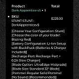 There were a great many options to choose from, so I went with the "Express Stunt" option to make it simpler. Chose the silver blade that comes with colored discs, allowing me to change the blade color. I love it, great saber, swap out colors every week or two.