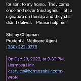 On 12/14/22 I placed my order with Hermosa who has delivered to me before. However, here I am on December 27 and I still don't have my product. The reason Chris who is the delivery guy in the Short North per the store located in the Short North. He is the reason why I'm not getting my packages. He is being vindictive and facetious irregardless of his position as an employee with UPS. And UPS doesn't care that I'm not getting my package.