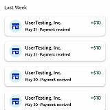 My name is Dan and UserTesting has paid me out over $165.00 in the last 3 weeks and tests keep on coming. The Screener questions are difficult to get past most of the time but they are looking for people that are actually going to be useful for their studies. I've Participated in 3 Live Tests with the customer on the other end of a zoom call and those tests pay $30.00 to $90.00 for 45 minutes of my time. Remember to be truthful when you're doing the Screener because if you aren't, and you can't provide proof of your answers, they will kick you out or give you a negative review (which basically means that nobody will want to use you for their test). At the rate that I'm going, answering honestly and taking about 2 hours a day to go through screener questions, I'm going to average about $200.00 extra, easy money every week. The more positive reviews you get from your customers, the more tests will be available to you. I do admit that failing 90% of the screeners is a bit off putting but. When you do get past them, you make $4.00, $10.00, $20.00, $30.00, $40.00, $60.00 and $90.00 for less than an hour of your time. WELL WORTH IT for me. Thanks for reading. (P. S) My wife also does it on her phone and our daughter on her phone so. That's almost $600.00 a week between the 3 of us. Pays the house payment almost. I've added a screenshot of part of this week's payout schedule. It takes EXACTLY 7 days, to the minute, from when you take the test to get paid. I've also added a screenshot of my Paypal account screen so you can see that the money is coming to me.