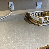 Kitchen counter has stains on it. I also love how someone watered down the hand soap (Mrs Meyers) that is on the counter.