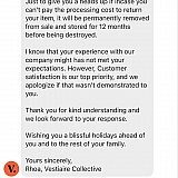 First and last time using Vestiare. Fortunately I worked the system and took advantage of their $50 off. I suppose eventually I'll get my item and it'll be worth it. But never again. And LOL to whoever keeps copy pasting the same corporate response. Get a real job, loser.
