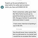 First time I'm not complaining about the courier or the seller but vinted the transaction website. They marked my item as delivered even though the courier and tracking information shows it isn't the case. They then only gave me 2 days to collect my parcel/raise issues before they close the case. When the actual courier had given me 5 days! It was dishonest and BBC watchdog have a piece on them! Don't use it's a scam!