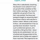 Due to the malicious damage, I advised vintage I was no longer willing to accept a return and asked them to view the chat history as there was no discussion of there ever being damage ‘a hole' in the item. Vintage asked the buyer to send photos 5 days after they had received the item - plenty of time for malicious damage to be made and not a true representation on the item received, however Vinted turn a blind eye to this fact.