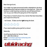 Ordered a new set wheels, called spoke to two different representatives regarding my order, they said they were contacting the supplier, put me on hold for 10 minutes then hung up with no response, I received an email after the first phone call telling me about the possible delays. As of November 2nd I still have received and feed back even after sending and email to customer service. Still up in the air about Vivid Racing, that is why I giving this review.