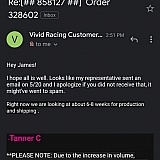 Can't compare to the other companies the custoner service is amazing, walked thru ordering and helped a lot with everything thank you vivid racing and to mr. Anthony for helping me.