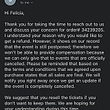 This has been the worst experience of any company I have ever used for anything. At this point I have spent hours of my life trying to get a refund or credit for a concert they cancelled, as it says they will do in their agreement upon purchase. They continue to transfer and put on hold and then just hang up and do not respond to emails.