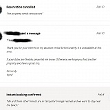 My son and daughter in law were scammed by a property owner and were canceled last minute with no communication and only a partial refundcby a property owner in lake placid florida. No available hotels. VRBO was only interested in helping the property owners who after ready reviews had pulled the same thing before. What a horrible person. What a horrible company. Don't fall victim to these scum bags. They ended up in my overcrowded house when they just wanted to be alone after a miscarriage that same day.