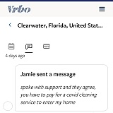 We booked a condo in Clearwater Florida. We paid 100% per contract. 2 weeks before we were supposed to be going there the homeowner said he would not let us on the property unless we paid another $260. I called Vrbo numerous times to try to get support. How are we supposed to stay at somebody's house that pulls this bait-and-switch. So they lock us out with all of our stuff in there next and then tell us they won't let us end unless we give them more money. Or they claim me to damages we didn't do? It's clear that these homeowners are con artists. Why would Vrbo want to be in bed with them. We booked through a website like them to make sure we're booking with people that we can trust. Not only did Vrbo not help us they refuse to let us talk to a supervisor or anybody else.