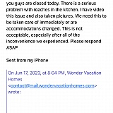 We checked in Saturday evening 6/17 got up to cook breakfast Sunday morning 6/18 and noticed at first one roach then several all over the counter in clusters, on the floor inside the dishwasher. Tried to call the property manager at wonderful vacation homes no answer left messages and sent emails. We figured the where not in on Sunday 6/18 so first thing Monday 6/19 I called and the response was lack luster but said someone would come out today 6/19 but then we gent and email response from the property saying someone will come out tomorrow in 6/20. No response again we we tried to call. I have requested other accommodations but I was told we have to wait until maintenance comes out. Maintenance came out this morning at 10:50 on 6/20 and was startled at the amount of infestation, he sprayed and told us he'll be back tomorrow. We paid for a vacation home with a kitchen, we have been forced to make other arrangements at our expense. This is completely unacceptable and I have video and consistent emails to the Wonderful Vacation Homes. I reported wonderful vacation homes to the better business bureau. This management company had the audacity to lie and say we brought the roach infestation to there filthy property. They have an F rating with the better business bureau. Do NOT rent from them they have misleading pictures of the homes and obviously fake reviews on the website. We're taking legal action, because our vacation was completely ruined by this company. Please beware do NOT sacrifice your vacation or your peace of mind nor your love ones. This is a horrible company.