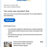 I ordered a white upholstered chair in July. Someone else had ordered laundry detergent that was on the truck. It wasn't sealed properly and spilled onto the box my white chair was in. Purolator called and explained, I told them to return the chair and I'd try again in a month. Over the past 3 days I have tried to order the chair again. The order goes through, then within 5 minutes I get an email "Order canceled". Walmart keeps canceling the order. I talked to the bank who was now flagging it as suspicious, but removed the flag. I've spent way too much time on the phone with their Customer Service which happens to be in India - but they refuse to tell you where they are located when you ask. I'm sorry, but rarely do I get good Customer Service from India, probably why their rating is only 1.1 stars. If my daughter didn't want this chair so badly I'd have given up after the first time. I definitely gave them way too many chances, but we are now done with Walmart. Oh, and after wasting hours of my time, they increased the shipping amount so it was going to cost me more! Walmart.ca is a joke.