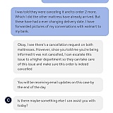 I have been trying to cancel an order for 5 days. The order has said delayed arriving today since the 19th and it's the 22nd. Was told after the original delay that they would be arriving by 2pm, the next day, and not at all. Was told people didn't cancel it, been told they did. I was told to reorder mattress which I did and already received. It has just been a run around I have called your help line twice. I have messaged several times. If product isn't received or cancel and money returned, my bank said to file a dispute on the money already withdrawn. I have had so many issues with walmart this year, got to the point I canceled my walmart+ and stopped buying groceries at your locations. After this experience I am completely done with shopping at Walmart all together. I get more reliability from Wish.com